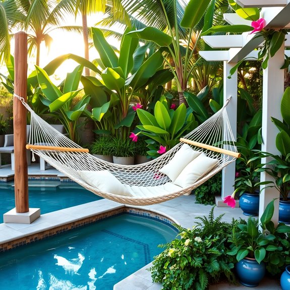 Add layers of potted tropical plants in varying heights, focusing on those that thrive in humid environments. Even with a small pool area, positioning the hammock at an angle can maximize space while maintaining the luxurious atmosphere of a private resort.