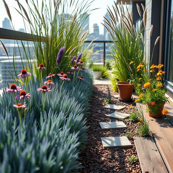 Swaying prairie dropseed and purple coneflowers create a mesmerizing tapestry of movement and color, transforming urban balconies into miniature meadows. Little bluestem catches the golden hour light, its silver-blue stems turning champagne as the sun sets, while black-eyed Susans and butterfly weed add vibrant splashes of yellow and orange.